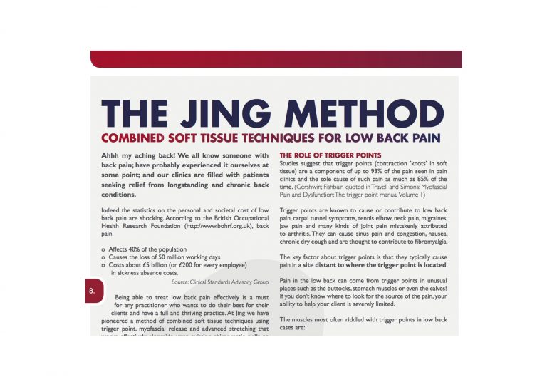 Being able to treat low back pain effectively is a must for any practitioner who wants to do their best for their clients and have a full and thriving practice. At Jing we have pioneered a method of combined soft tissue techniques using trigger point, myofascial release and advanced stretching that works effectively alongside your existing chiropractic skills to reduce client pain in 1-6 weekly treatments.